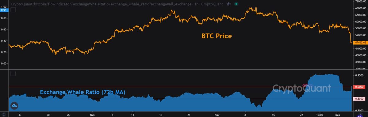 上周早些时候,比特币交易所巨鲸比例飙升至 91%,创下三年来新高。交易所巨鲸比例指的是排名前十的存款金额占所有交易所总存款金额的约比例。.