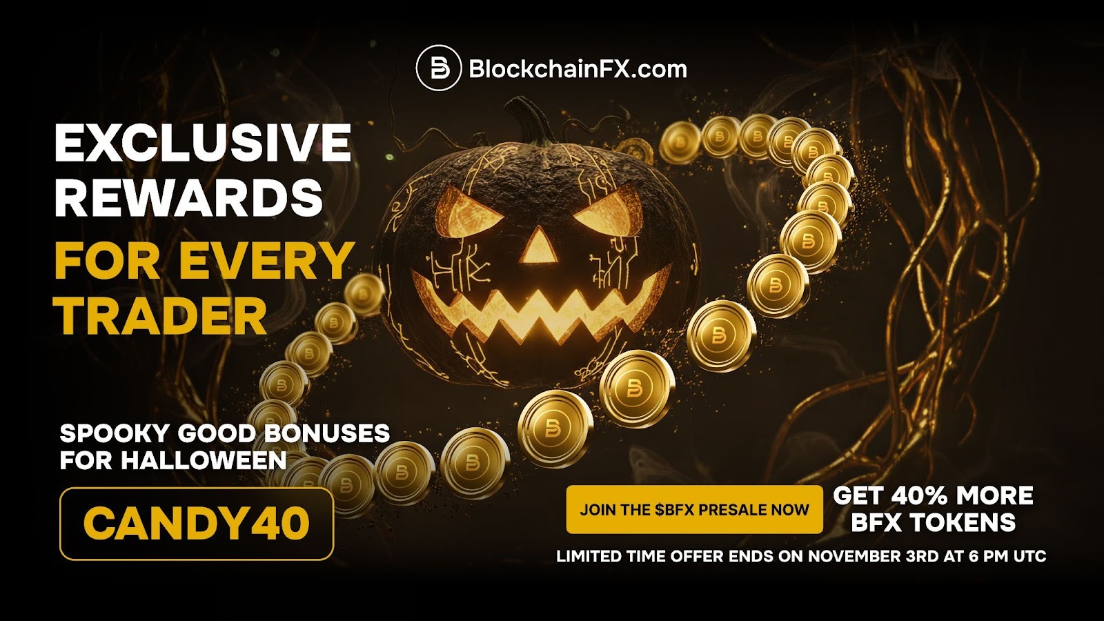 立即获取 BlockchainFX ($BFX) 代币,并在 11 月 3 日前使用代码 CANDY40 可额外获得 40% 的代币。.