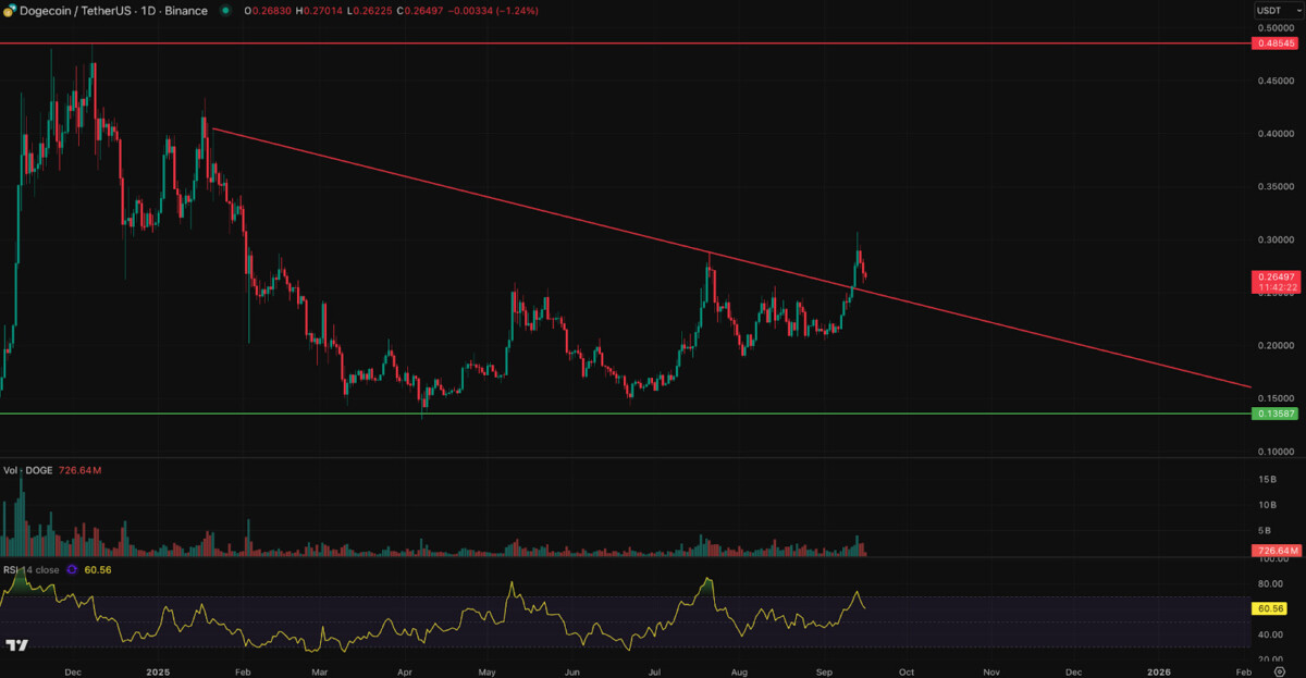 CleanCore Solutions 筹集了 1.75 亿美元用于购买狗狗币 (DOGE),进一步推高了市场需求,机构投资者和散户投资者纷纷追捧这一突破性进展。当时,狗狗币的上涨势头似乎不可阻挡。.