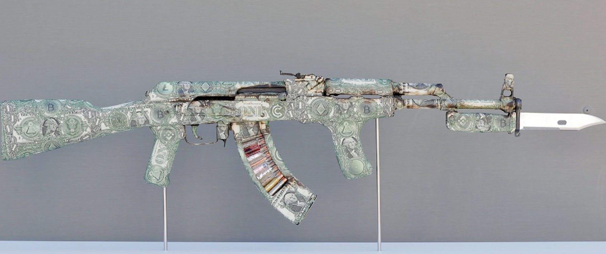 这位艺术家使用一支从阿富汗冲突中缴获的已失效的 AK47 步枪,手工剪裁出真正的美元钞票上的细节,然后精心融入 Bitcoin、 Ethereum、 Litecoin 等绿色货币般的加密货币标志,巧妙地装饰了这支步枪。.