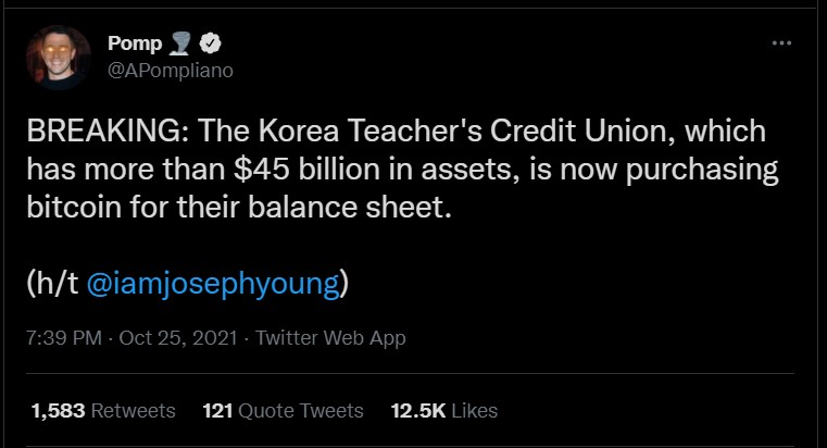 韩国教师信用合作社是韩国最大的互助组织,已投资Bitcoin传闻。该组织管理着超过340亿美元的资产,是韩国最大的机构投资者之一。