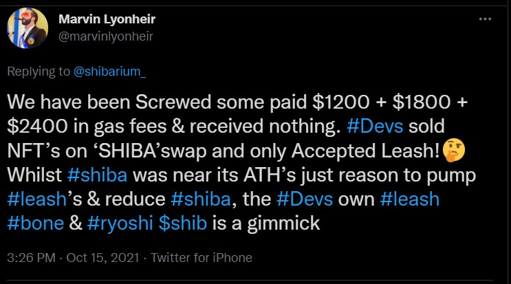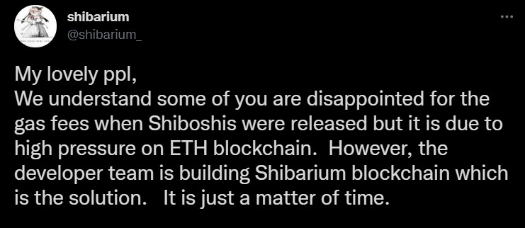 Shibarium 在推特上解释了这个问题,称高额的 gas 费用是由于以太坊区块链承受了巨大的压力。该推文还承诺, Shiba 的开发团队正在构建 Shibarium 区块链来解决这个问题。.