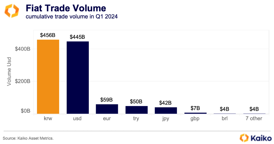 2024 年第一季度,韩元 (KRW) 成为全球对加密货币交易量最大的法定货币。