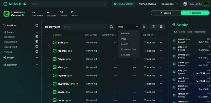 SPACE ID 3.0 部署了一套基础设施,使所有顶级域名 (TLD) 都能访问专属的域名NFT市场,从而实现无缝的域名交易。该平台整合了来自 OpenSea、Element、ENSVision 等多个来源的域名,提供一站式域名发现、购买和上架服务。