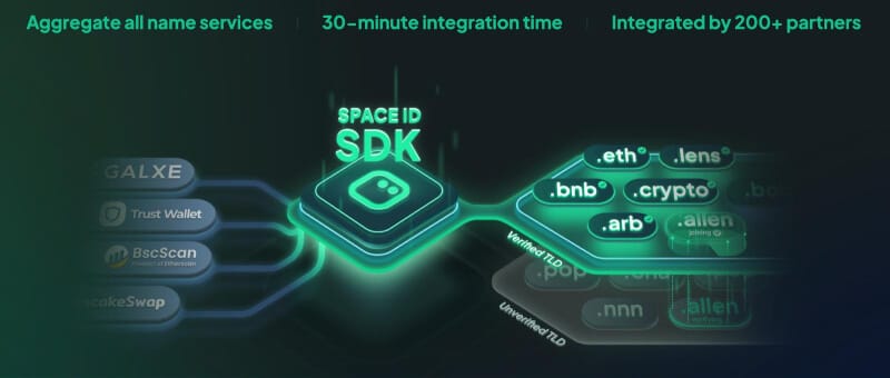 SPACE ID 推出了功能全面的 Web3 名称 SDK,其特性旨在简化域名解析和反向解析,使开发者能够充分发挥 SPACE ID 3.0 的潜力,将其应用于各种应用程序。该 SDK 支持多种顶级域名 (TLD),并能动态适应新验证的 TLD,确保域名解析和反向解析的无缝集成。