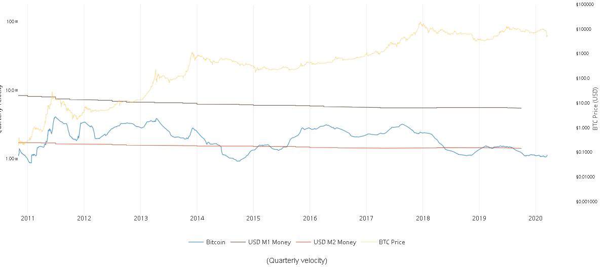 观察这张图表有助于我们了解比特币的商业流通速度,并将其与M1和M2货币供应量进行比较。Bitcoin的速度。该图表展示了BTC货币流通速度与M1和M2货币供应量的关系图。