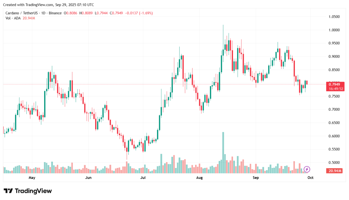 Cardano 目前交易价格接近 0.79 美元,tron支撑位在 0.75 美元附近,阻力位接近 0.90 美元。从 TradingView 图表可以看出,价格走势显示,在夏季上涨之后进入盘整阶段。日成交量适中,买家正在等待突破催化剂。.